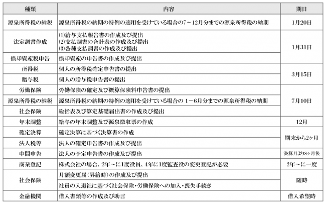 設立後は本業に加えて、下記の手続き業務も期日に従って処理しなければなりません。